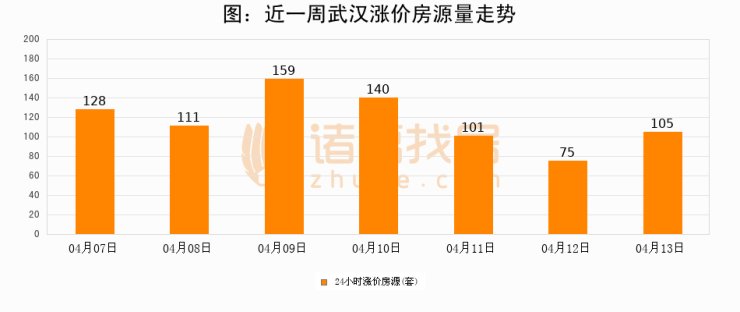 根据诸葛找房数据显示,武汉24小时涨价房源量为105套,较04月12日增加30套,环比上涨40%。与此同时,涨价房源占比小幅扩大,业主信心有所提升。