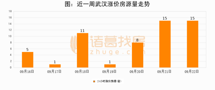 根据诸葛找房数据显示,武汉24小时涨价房源量为15套,较09月21日持平。