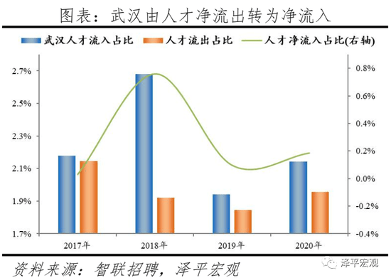 不仅如此,还要看到武汉的人才数据。据《中国城市人才吸引力排名:2021》报告数据显示,武汉为应届生流入人口排行前十,由人才净流出转为净流入。根据武汉市委组织部公布的数据,2017-2019年新增留汉大学生共109.5万人,提前两年完成2017年确定的五年达到100万的目标;2020年,新增留汉大学生30.2万人。