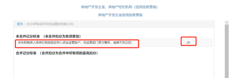 此外,还有其他项目分别因“商品房不能如期交付,未按规定提前30日书面告知买受人”“以学区房等名义炒作房价”“与买受人协商一致,但未按规定或约定期限退还房价款”等被扣信用分。