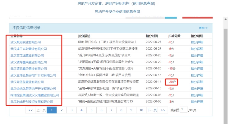 较高扣了20分!6月武汉这10家房企被扣信用分