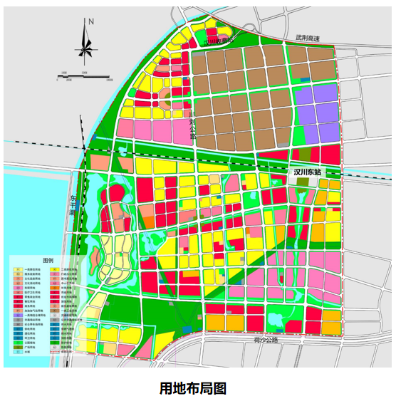 汉川市沿江高铁汉川东站片区,北至武荆高速、南至荷沙公路、西至东干渠、东至福星路,规划用地面积约29.39平方公里(约)。