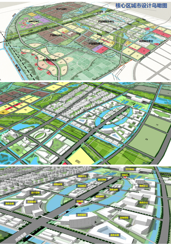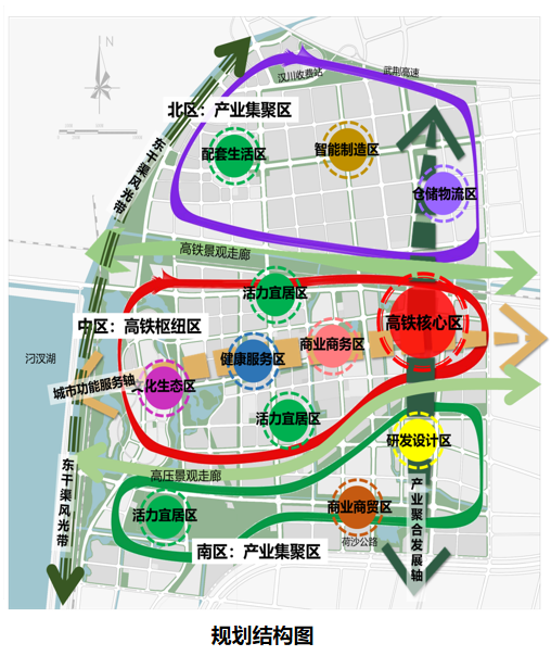 产业发展方向:构建““3+3+2”产业体系”,三大战略突破型产业:现代物流、研发设计、智能制造;三大平台服务型产业:文化会展、智慧商务、专业服务;两大特色配套型产业:文旅产业、大健康产业。规划“一核两轴三区、一带两廊多点”的城市空间结构,一核:高铁核心区;两轴:产业聚合发展轴、城市功能服务轴;三区:北区:产业集聚区、中区:高铁枢纽区、南区:产业集聚区;一带:东干渠风光带;两廊:高铁景观生态走廊、 高压景观生态走廊;多点:各个功能区景观节点。