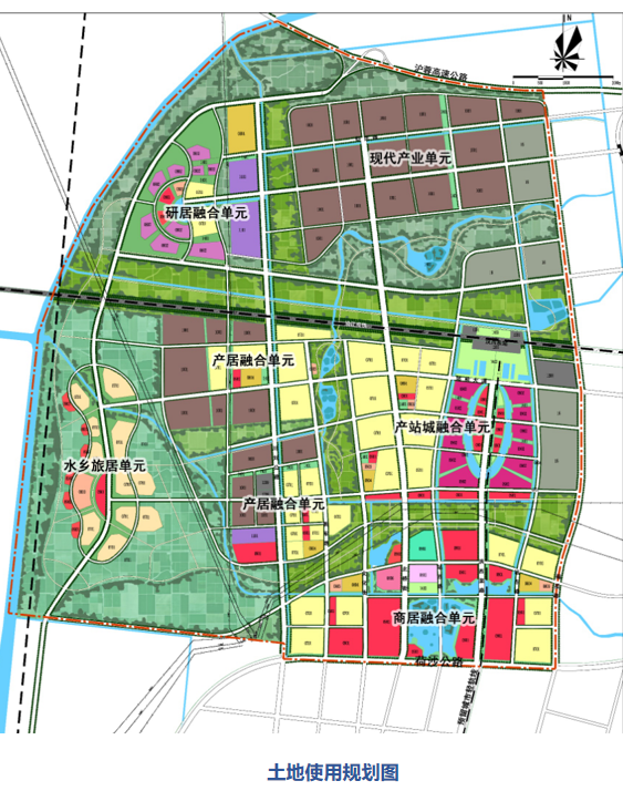 规划形成“一主两副、四横四纵、特色七区、城景交融”的空间结构,围绕“修站-营景-筑城”的路径一体联动开发,致力于建设干净的生态田园城市。布置城市建设用地19.6平方公里,主要以商业商务、居住、产业用地为主;布置基本农田、生态廊道、水系等非城市建设用地面积为10平方公里。