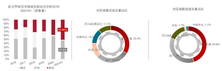 从租赁成交企业类型来看,上半年武汉甲级写字楼租赁需求主要来自专业服务业、TMT和金融行业。从成交驱动因素来看,随着武汉市经济快速复苏及招商引资政策的全面推进,甲级写字楼市场新设企业办公需求逐步增长,新设租赁需求约占上半年武汉甲级写字楼市场成交量的约50.9%。分区域来看,不管是新设需求还是搬迁需求均集中在存量较大且近期新交付楼宇较多的汉口片区。此外值得注意的是光谷商务区上半年成交需求主要表现为搬迁,由于光谷片区甲级写字楼市场整体一直处于供不应求的状态,泛悦中心T2的交付带来了搬迁需求的释放空间。下半年,武汉核心商务区甲级写字楼市场预计还将迎来包括武汉天地A1、首地王家墩、中海中心等在内的约29.9万平方米的优质办公空间集中交付。