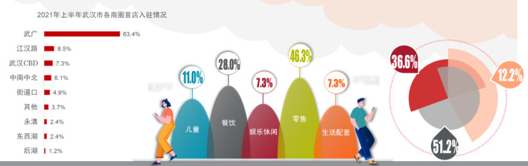 优质新项目的陆续开业也推动武汉零售市场进入新一轮的首店经济活跃期,其中武广商圈、江汉路商圈、武汉CBD片区分别位列前三甲。分业态来看,上半年入驻首店主要集中在零售、餐饮和儿童类业态。从首店类型来看,上半年入驻的首店以武汉首店为主,其次是华中首店占比,全国首店占比12.2%。