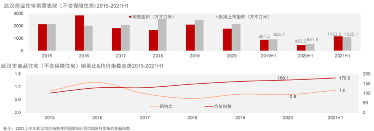 2021年上半年,武汉市商品住宅批准上市面积1085.1万平方米,从销供比来看,市场整体暂处供需均衡状态:2021年上半年销供比1.0,处于合理区间。销售均价指数显示,截至2021年6月武汉市商品住宅成交均价较2020年末上涨约5.6%。