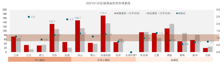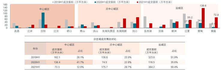 分区域来看,上半年武汉住宅市场成交热点区域集中在东湖高新区、洪山区和汉阳区,次热点区域则集中在远城区的黄陂、东西湖和江夏。