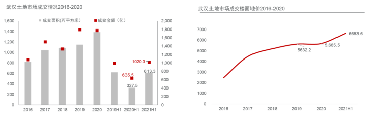 2021年上半年,整体市场量价齐升。武汉共挂牌出让地块91宗,其中最终成交84宗,成交宗数较去年同期增加35宗。2021年上半年武汉土地成交楼面地价6653.6元/平方米,较去年同期上涨约17.0%。远城区成供地主力,蔡甸、黄陂和江夏等片区土地成交面积均同比大幅提升。次中心城区成交主力集中在东湖高新和沌口。中心城区土地成交面积持续下降,仅占上半年成交面积的12.0%。从分区楼面地价来看,2021年上半年次中心城区和远城区引领武汉市整体楼面均价的上涨,其中东西湖区、江夏区、东湖高新区、新洲区、经济开发区(沌口)、黄陂区涨幅显著。