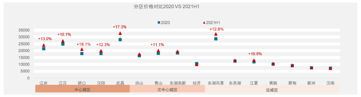 从分区销供比来看,上半年除中心城区江汉和武昌区出现较为明显的供不应求、远城区的蔡甸、新洲和汉南有略微的供过于求外,武汉市大部分区域仍处于销供比的合理区间。从分区成交价格来看,中心城区引领上半年武汉市房价上涨,较2020年末涨幅超10%的区域均大部分集中于中心城区,中心城区以外只有青山区和江夏区涨幅超10%。
