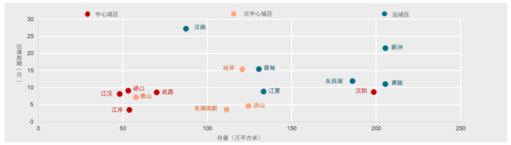 从分区商品住宅存量结合其过去6个月的去化速度来看:中心城区和次中心城区的整体出清周期要整体短于远城区,其中东湖高新区、洪山区和汉阳区存量超100万平方米但出清周期仍能保持在10个月以内,显示出较高的区域市场热度;远城区只有江夏区目前的出清周期在10个月以内。整体来看,上半年武汉市商品住宅市场区域分化显著,由于市场购房主力仍以刚需为主,成交主力板块集中在次中心城区。此外,远城区的部分区域如东西湖、黄陂和江夏热度有上升趋势,或将成为下一波潜力热点板块。