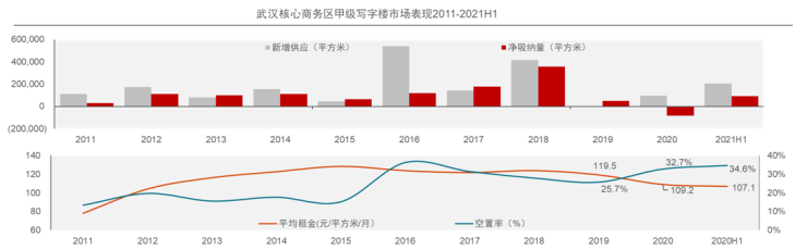 2021年上半年, 恒隆中心和泛悦中心T2的入市为武汉甲级写字楼带来约20.4万平方米的优质新增供应,推动全市优质甲级写字楼存量至245.0万平方米。近期优质项目的陆续交付推动武汉甲级写字楼市场吸纳持续回暖,上半年核心商务区共录得约9.0万平方米的净吸纳量。另一方面,新项目的集中入市也推动了市场整体空置率的上升,截至二季度末武汉核心商务区甲级写字楼整体空置率34.6%,环比一季度下降约0.2个百分点,比去年同期上升约3.8个百分点。租金方面,面对新一轮的供应井喷期,业主纷纷下调租金以加速去化。