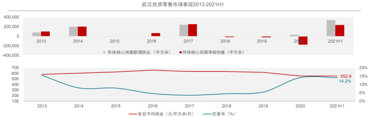 从整体供应量来看,2021年无疑是武汉优质零售市场供应井喷的一年,且新增供应多位于老牌核心商圈,短期内市场品牌招商运营难度或进一步增加。下半年,武汉零售市场预计还将迎来包括大悦城、泛悦城、华发中城商都等在内的约55.9万平方米的新增供应。