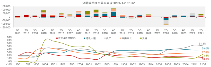 一季度恒隆中心以及二季度光谷泛悦中心T2的交付均带动所在商务区整体吸纳情况回升。从分区空置率情况来看,汉口片区由于甲级写字楼存量较大,优质新项目的集中交付短期内增加市场去化压力、空置率攀升,区域内的武广商务区目前是武汉核心商务区中空置率较高的区域,截至2021年二季度末录得空置率51.8%;其次是建设大道商务区,二季度末空置率38.0%。
