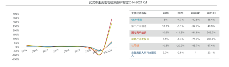 2021年一季度,武汉市经济开局表现良好,主要经济指标均呈现同比快速增长,其中固定资产投资,较去年同期大幅增长约343.3%,显示出强有力的复苏态势。横向对比来看,2021年一季度武汉市地区生产总值3574亿元,在9个国家中心城市中排名第6位。以上海为标尺对比国家中心城市主要经济指标值,武汉市虽然在常住人口、社零额和第三产业增加值等方面仍有较大的增长空间,但在人均GDP和城镇人均可支配收入表现上较为亮眼。