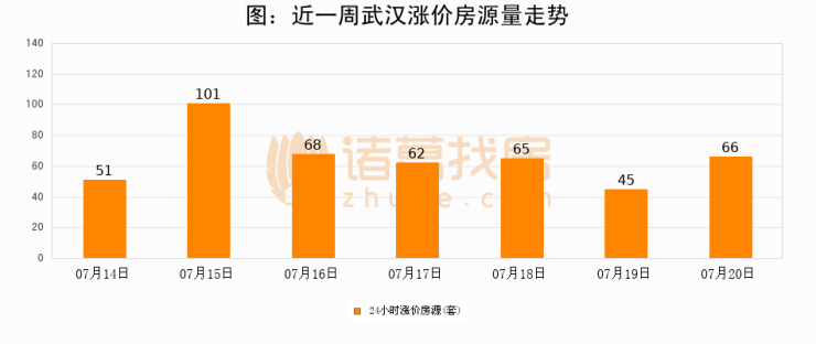 根据诸葛找房数据显示,武汉24小时涨价房源量为66套,较07月19日增加21套,环比上涨46.7%。与此同时,涨价房源占比小幅扩大,业主信心有所提升。