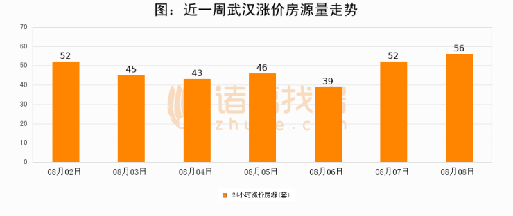 根据诸葛找房数据显示,武汉24小时涨价房源量为56套,较08月07日增加4套,环比上涨7.7%。与此同时,涨价房源占比小幅扩大,业主信心有所提升。