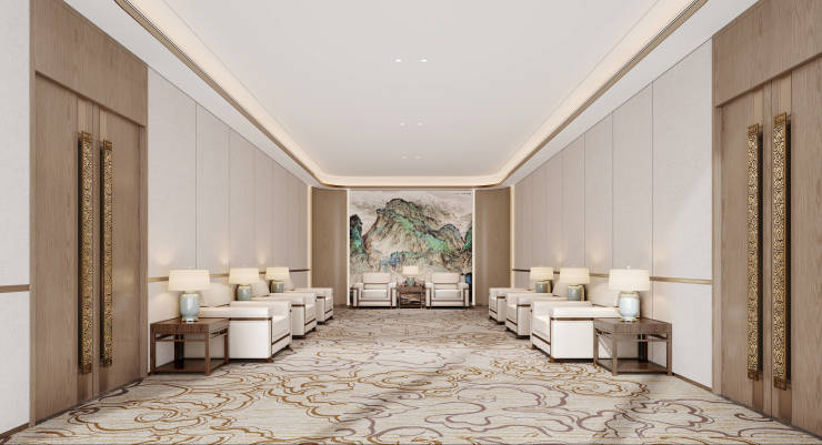 主体建筑与西南侧玉泉山形成45度视觉通廊,二层观景台向北延伸,将桃子冲水库的潋滟波光纳入建筑视野。景观资源的充分利用,彰显人与自然和谐共生的山水理念。