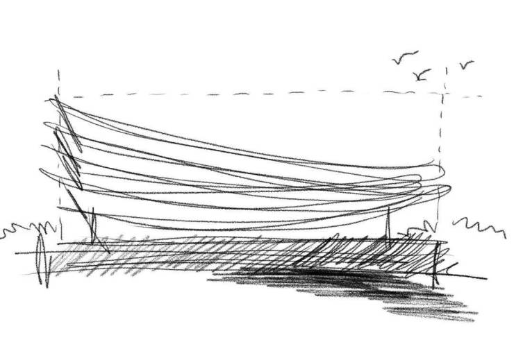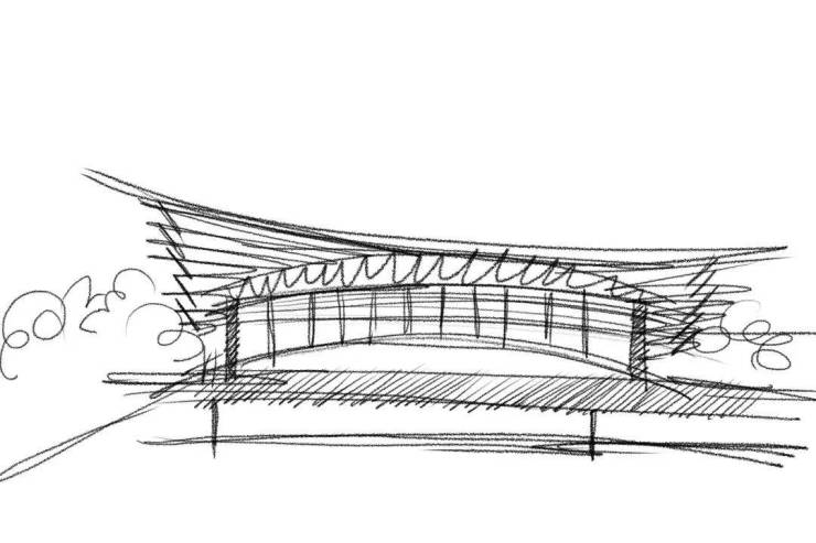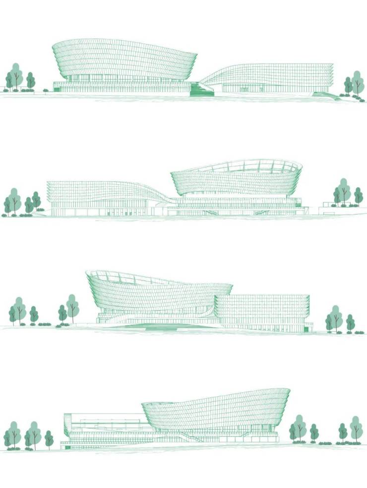 建筑整体如“如意”横卧,南端篮球馆为“如意头”,旁侧地块全民健身中心为“如意柄”,屋面曲线象征吉祥寓意。