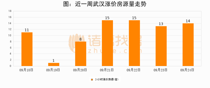 根据诸葛找房数据显示,武汉24小时涨价房源量为14套,较09月23日增加1套,环比上涨7.7%。与此同时,涨价房源占比小幅扩大,业主信心有所提升。