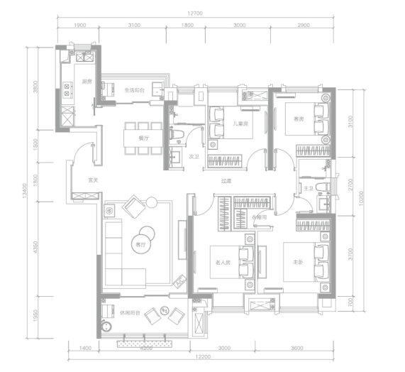 户型的设计,一定以居者生活习惯为基础。主卧套间及干湿分区卫生间,较大限度的考虑了人类生活理想及生活习惯,舒适指数颇高。