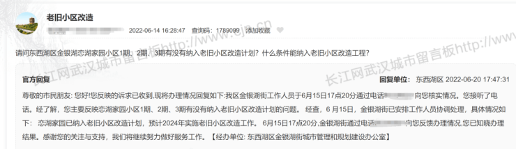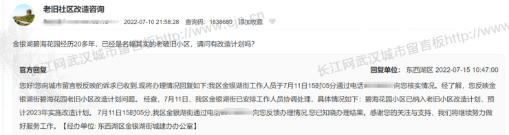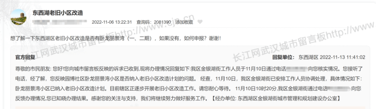 问:想了解一下东西湖区老旧小区改造是否有卧龙丽景湾(一、二期)