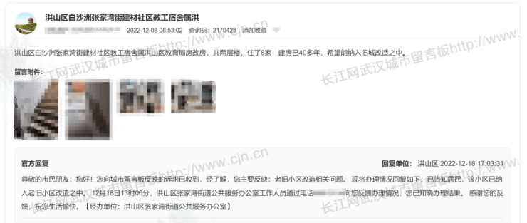 问:洪山区白沙洲张家湾街建材社区教工宿舍属洪山区教育局房改房,共两层楼,住了8家,建房已40多年,希望能纳入旧城改造之中。