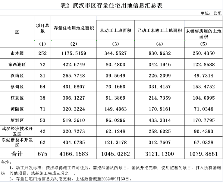 武汉存量项目共计675个,其中存量住宅用地总面积4166.1583万平方米,未动工土地面积1045.0282万平方米,已动工未竣工土地面积3121.1300平方米,未销售房屋的土地面积1079.8861万平方米。