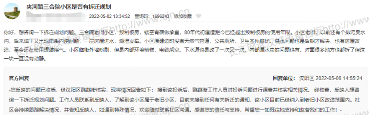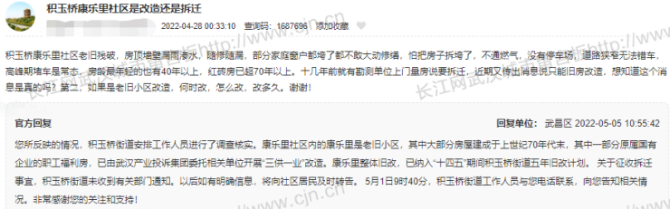 武昌区:经调查核实,康乐里社区内的康乐里是老旧小区,其中大部分房屋建成于上世纪70年代末,其中一部分原属国有企业的职工福利房,已由武汉产业投诉集团委托相关单位开展“三供一业”改造。康乐里整体旧改,已纳入“十四五”期间积玉桥街道五年旧改计划。