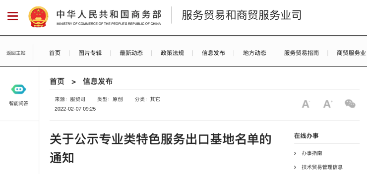 2021年11月,商务部、中央宣传部、教育部、自然资源部、人力资源社会保障部、知识产权局、中国外文局等7部门,共同组织开展人力资源服务、地理信息服务、知识产权服务和语言服务等4个领域的特色服务出口基地评审认定工作。