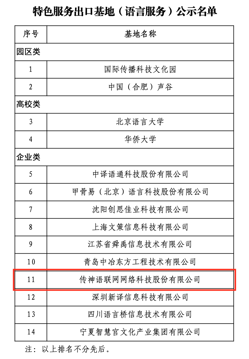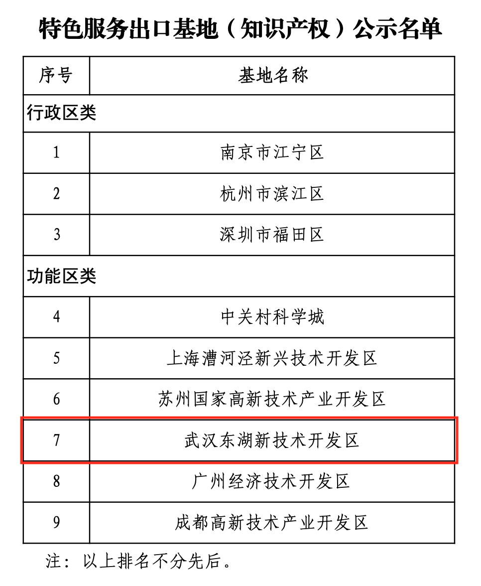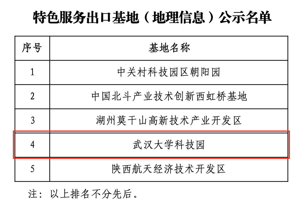 其中,中国武汉人力资源服务产业园入选人力资源服务出口基地,武汉东湖新技术开发区入选知识产权服务出口基地,武大科技园入选地理信息服务出口基地,传神语联网网络科技股份有限公司入选语言服务出口基地。