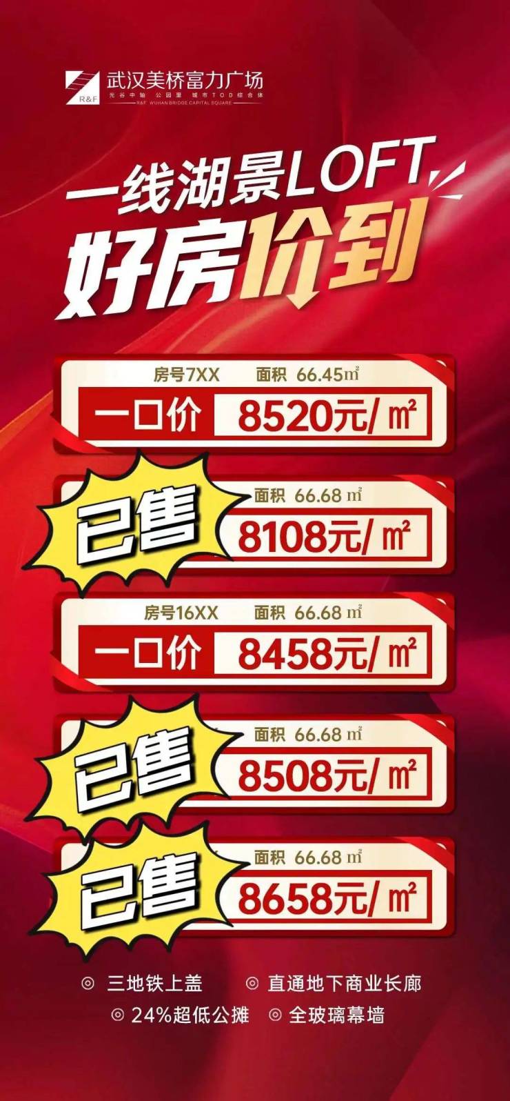 项目位于光谷五路与神墩三路交汇处,地铁11号线光谷五路地铁口,毛坯,40年产权公寓,整体均价12500元/平,目前特价房源8458元/平,建面66平总价优惠约26万元!