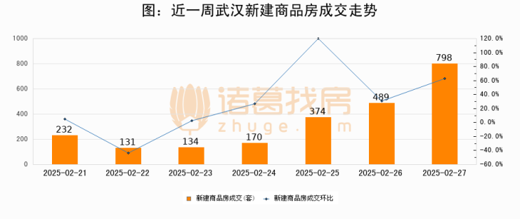 根据武汉市住房保障和房屋管理局数据显示,2025年02月27日武汉新建商品房成交798套,较昨日增加309套,环比上涨63.2%。近一周武汉新建商品房日均成交333套。02月27日单日成交798套,高于近一周平均水平139.6%。