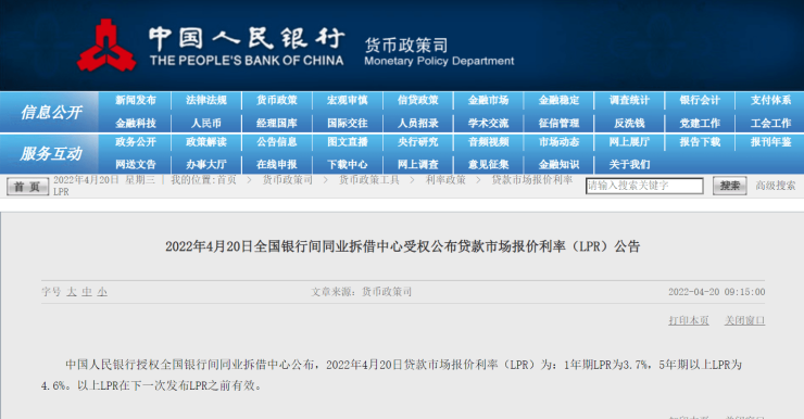 4月20日消息,搜狐焦点获悉, 中国人民银行授权全国银行间同业拆借中心公布,2022年4月20日贷款市场报价利率(LPR)为:1年期LPR为3.7%,5年期以上LPR为4.6%,连续三个月不变。