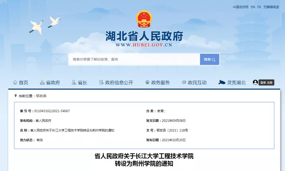 根据《教育部关于同意长江大学工程技术学院转设为荆州学院的函》(教发函〔2021〕83号),省人民政府决定将长江大学工程技术学院转设为荆州学院,同时撤销长江大学工程技术学院的建制。现就有关事项通知如下: