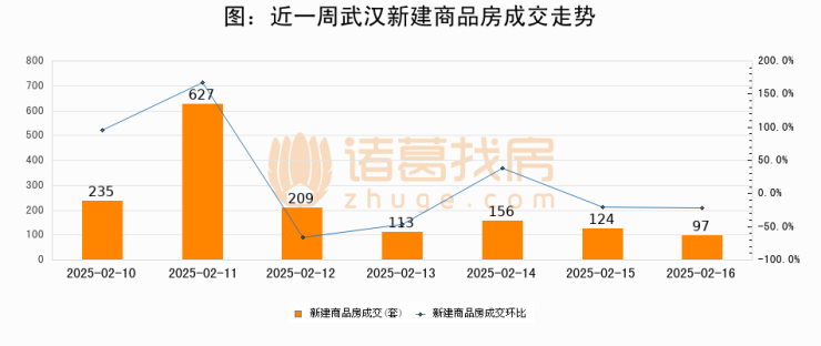 根据武汉市住房保障和房屋管理局数据显示,2025年02月16日武汉新建商品房成交97套,较昨日减少27套,环比下降21.8%