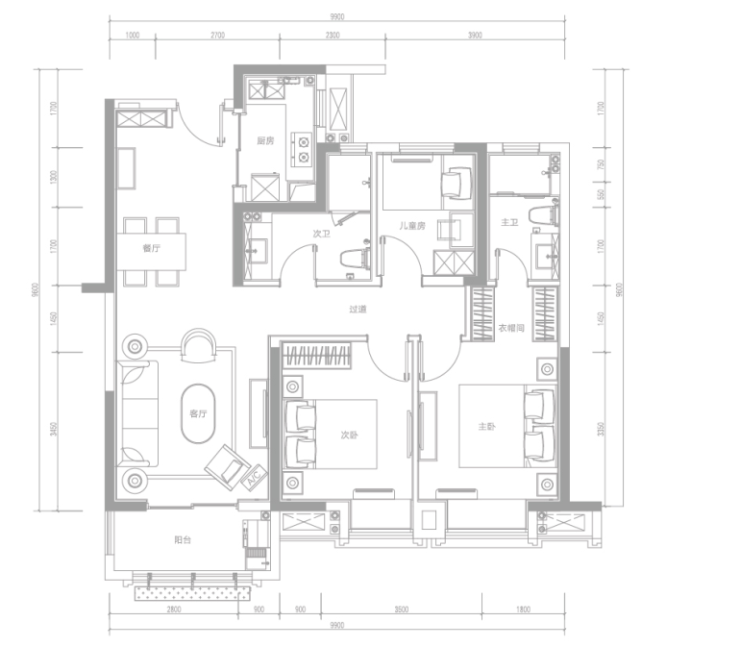ü 方正户型,餐客厨一体承接南向阳台,尺度开阔;