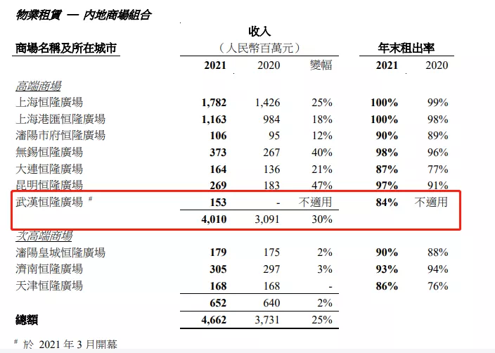 根据恒隆年报,截至年底,武汉恒隆广场商场出租率达84%。在办公楼租赁方面,于2020年11月开幕的武汉恒隆广场办公楼2021年年末出租率达57%,收入为0.46亿元,