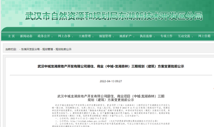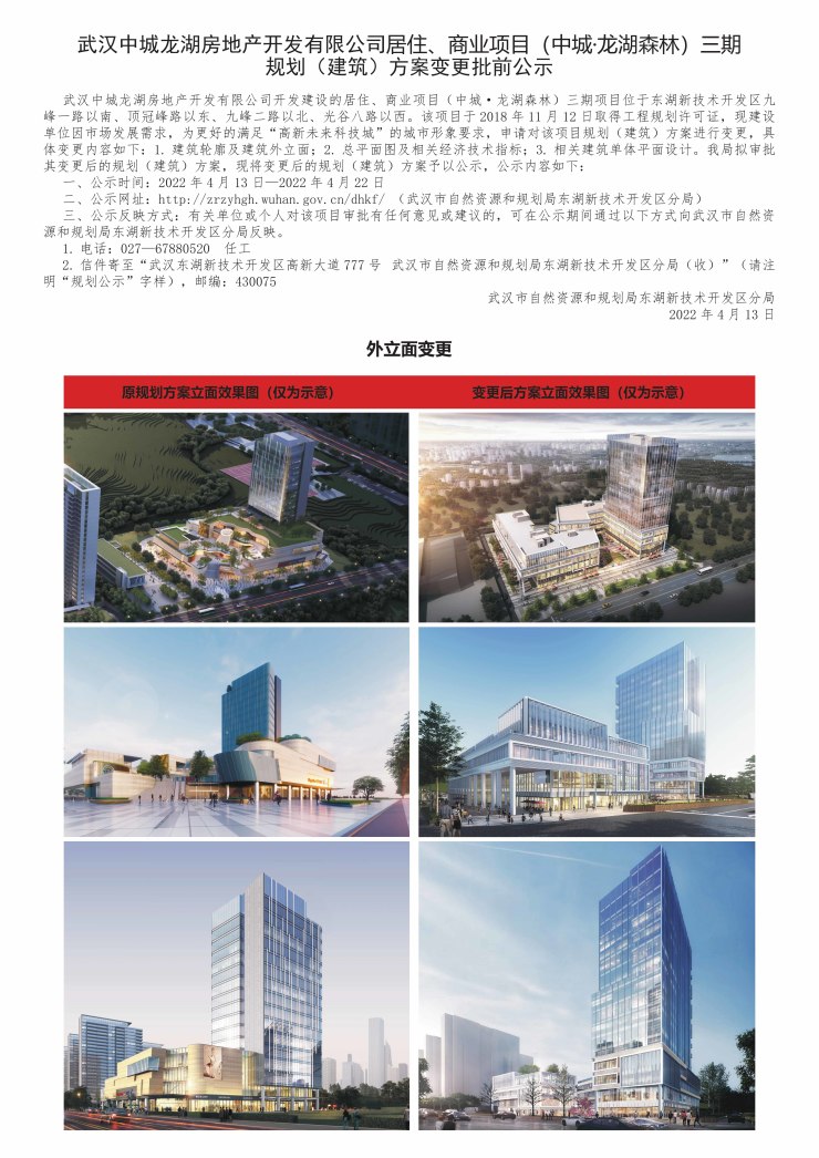 4月18日消息,搜狐焦点获悉,武汉市自然资源和规划局东湖新技术开发区分局发布了《中城·龙湖森林三期规划(建筑)方案变更批前公示》。