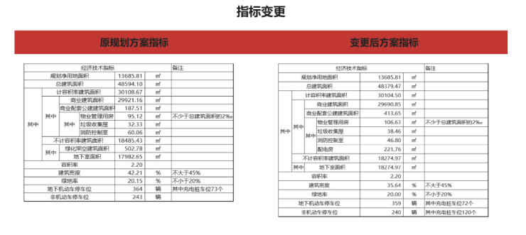 变更后经济技术指标如下:规划净用地面积13685.81平米,总建筑面积48379.47平米,其中,商业建筑面积29690.85平米,商业配套公建建筑面积413.65平米,容积率2.2,建筑密度35.64%,绿地率20%,地下机动车停车位359辆(其中充电桩车位72个),非机动车停车位240辆(其中充电桩车位120个)。