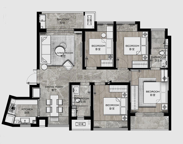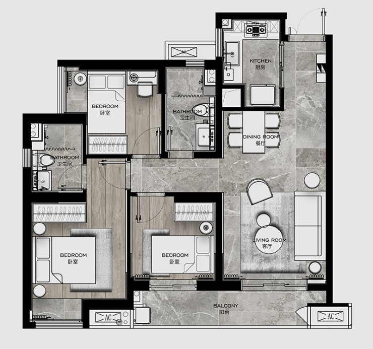 连通大阳台、套房主卧以及动静分区明确的设计,使102㎡的居住空间丝毫不会感觉局促。