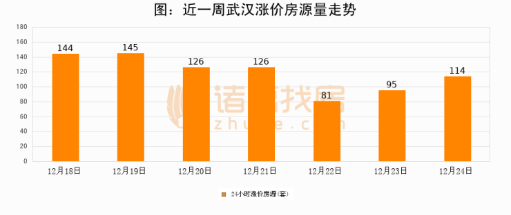 根据诸葛找房数据显示,武汉24小时涨价房源量为114套,较12月23日增加19套,环比上涨20%。与此同时,涨价房源占比小幅扩大,业主信心有所提升。