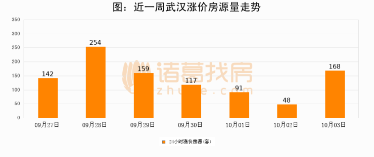根据诸葛找房数据显示,武汉24小时涨价房源量为168套,较10月02日增加120套,环比上涨250%。与此同时,涨价房源占比小幅扩大,业主信心有所提升。