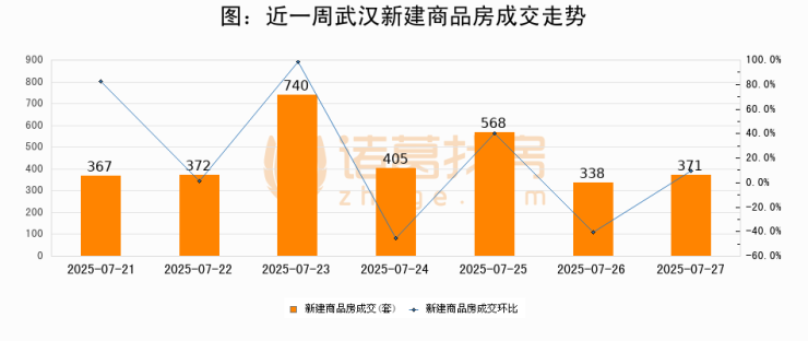 根据武汉市住房保障和房屋管理局数据显示,2025年07月27日武汉新建商品房成交371套,较昨日增加33套,环比上涨9.8%。近一周武汉新建商品房日均成交452套。07月27日单日成交371套,低于近一周平均水平17.9%。