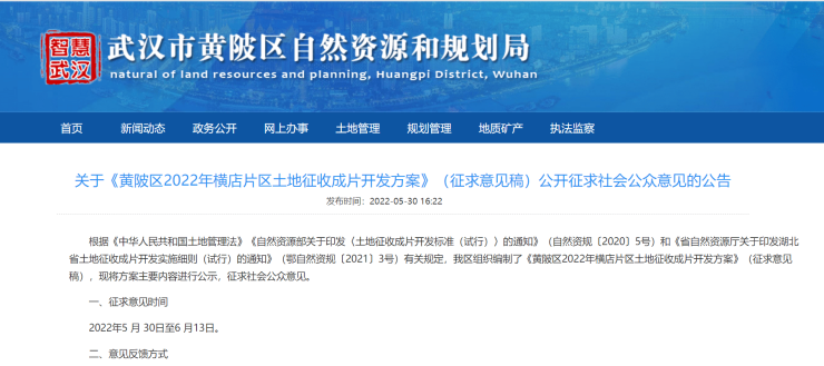 6月8日消息,搜狐焦点获悉,日前,黄陂区自然资源和规划局公示了关于《黄陂区2022年横店片区土地征收成片开发方案》(征求意见稿)公开征求社会公众意见的公告。