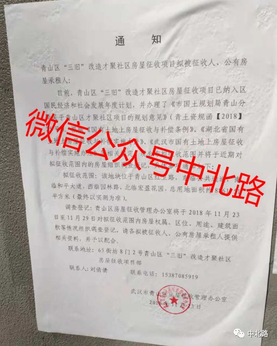 微信公众号中北路(作者姜华jianghua2046)获悉,武汉青山拆迁:才聚社区三旧改造房屋征收启动入户调查。 武汉青山拆迁:武汉搏昇房屋征收中标才聚社区、53街坊消防站政府采购服务!青山2018年征收审计机构招标2(7个包)中标结果变更! 武汉青山拆迁:“52、53街坊、红卫路街53街坊消防站、才