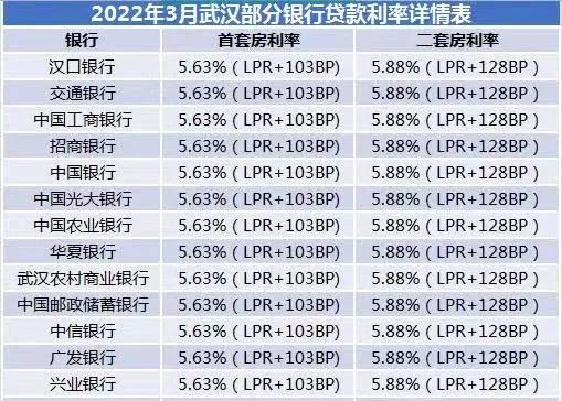 目前, 武汉主流的首套房商贷利率为5.63%(LPR+103BP),二套房商贷利率为5.88%(LPR+128BP) 。与2月份持平。