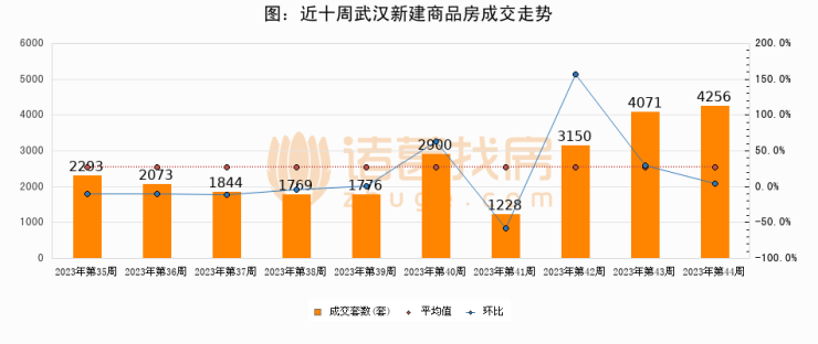 进入2023年第44周(10月23日-10月29日),武汉新建商品房成交4256套,较上周增加185套,环比上涨4.5%
