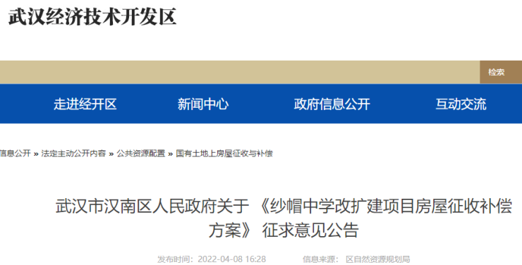 因公共利益需要,为促进我区教育事业发展根据《国有土地上房屋征收与补偿条例》、《湖北省国有土地上房屋征收与补偿实施办法》和《武汉市国有土地上房屋征收与补偿实施办法》的规定,现在房屋征收范围内公布《纱帽中学改扩建项目房屋征收补偿方案(征求意见稿)》,公告内容如下:
