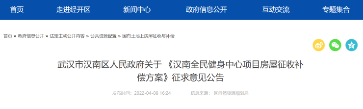 因公共利益需要,为促进我区全民健身事业的发展,提升全民健身、娱乐、休闲设施综合功能,根据《国有土地上房屋征收与补偿条例》、《湖北省国有土地上房屋征收与补偿实施办法》和《武汉市国有土地上房屋征收与补偿实施办法》的规定,现在房屋征收范围内公布《汉南全民健身中心项目房屋征收补偿方案(征求意见稿)》,公告内容如下: